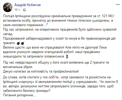 Во вторник, 10 сентября, в районе Ирпеня в Киевской области подозреваемый в нанесении тяжких телесных повреждений при задержании забаррикадировался в доме и отчаянно отбивался от полицейских. Об этом сообщил глава полиции Киевской области Андрей Небытов на своей странице в Facebook.