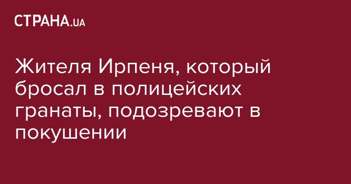 Ирпенский отдел Киево-Святошинской местной прокуратуры Киевской области уведомил о подозрении в покушении на убийство сотрудника правоохранительных органов мужчине, который во время его задержания оказал сопротивление сотрудникам полиции, в том числе бросил в них две гранаты.