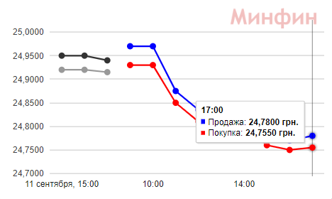 12 сентября НБУ поставил курс доллара 24,97 грн. В обменках доллар к вечеру покупают и продают ниже психологической отметки в 25 грн: покупка - 24,80 грн, продажа - 24,85 грн. На Межбанке доллар за день упал на 16 копеек и закрылся такими котировками: 24,75 грн - покупка и 24,78 - продажа. К вечеру доллар в банках покупают от 24,50 грн до 27,05 грн и продают от 24,83 грн до 27,70 грн (Альтбанк). В Приватбанке 24,65 грн - покупка и 25,05 - продажа.