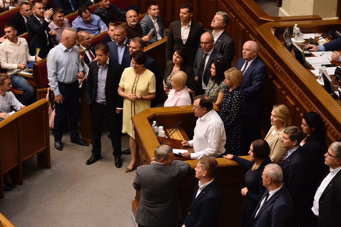 За трибуну встал нардеп Николай Княжицкий, вместе с ним вышли представители "Евросолидарности" в Раде: Петр Порошенко, Андрей Парубий, Ирина Геращенко, Ирина Луценко и другие.