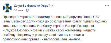 Глава Украины Владимир Зеленский дал поручение главе Службы безопасности Украины Ивану Баканову принять участие в расследовании факта поджога дома экс-главы Нацбанка Валерии Гонтаревой. Об этом во вторник сообщает пресс-центр спецслужбы в Facebook.