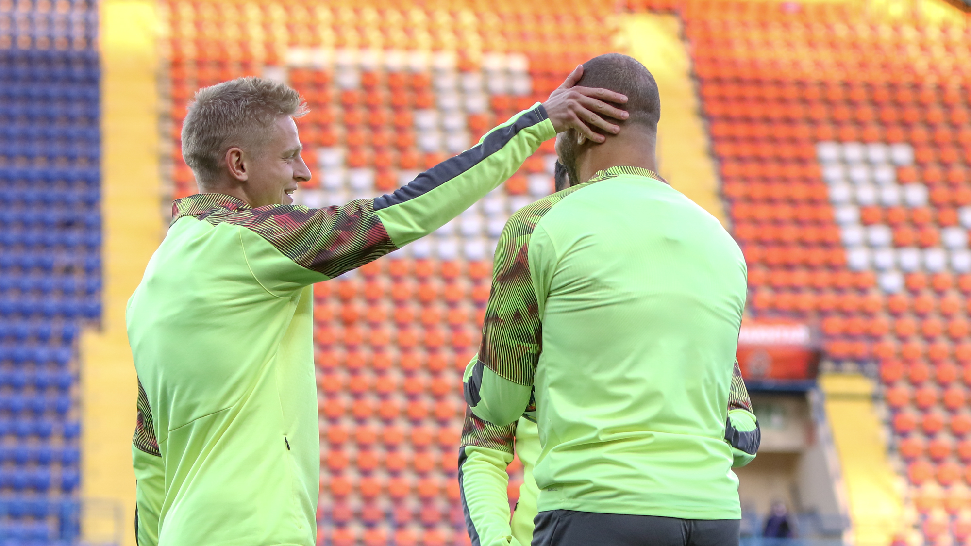 Журналистам удалось заснять первые 15 минут занятий чемпиона АПЛ. На поле тренировались и Александр Зинченко с Фернандиньо.