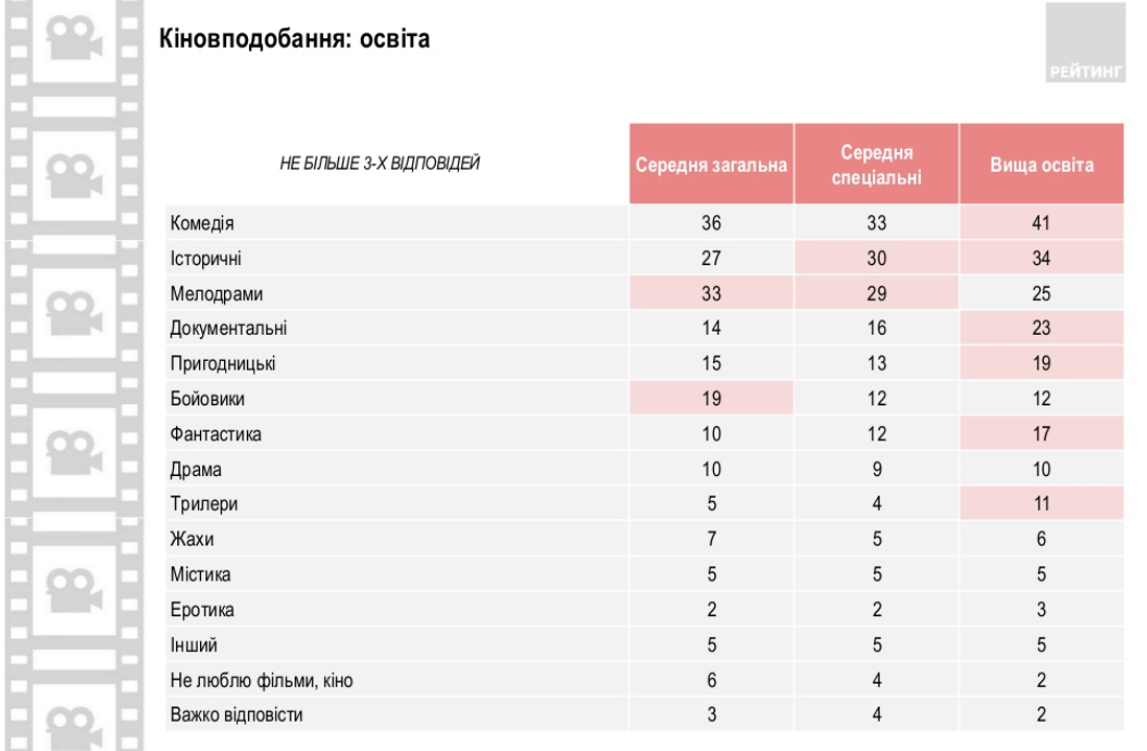 Вкусы украинцев в выборе фильмов также отличаются по уровню образования. Так, чем выше уровень образования, тем больше любят исторические, документальные фильмы и фантастику. Также представители с высшим образованием больше, чем другие любят комедии, приключенческие фильмы и триллеры. Людей со средним образованием больше остальных интересуют боевики и мелодрамы.