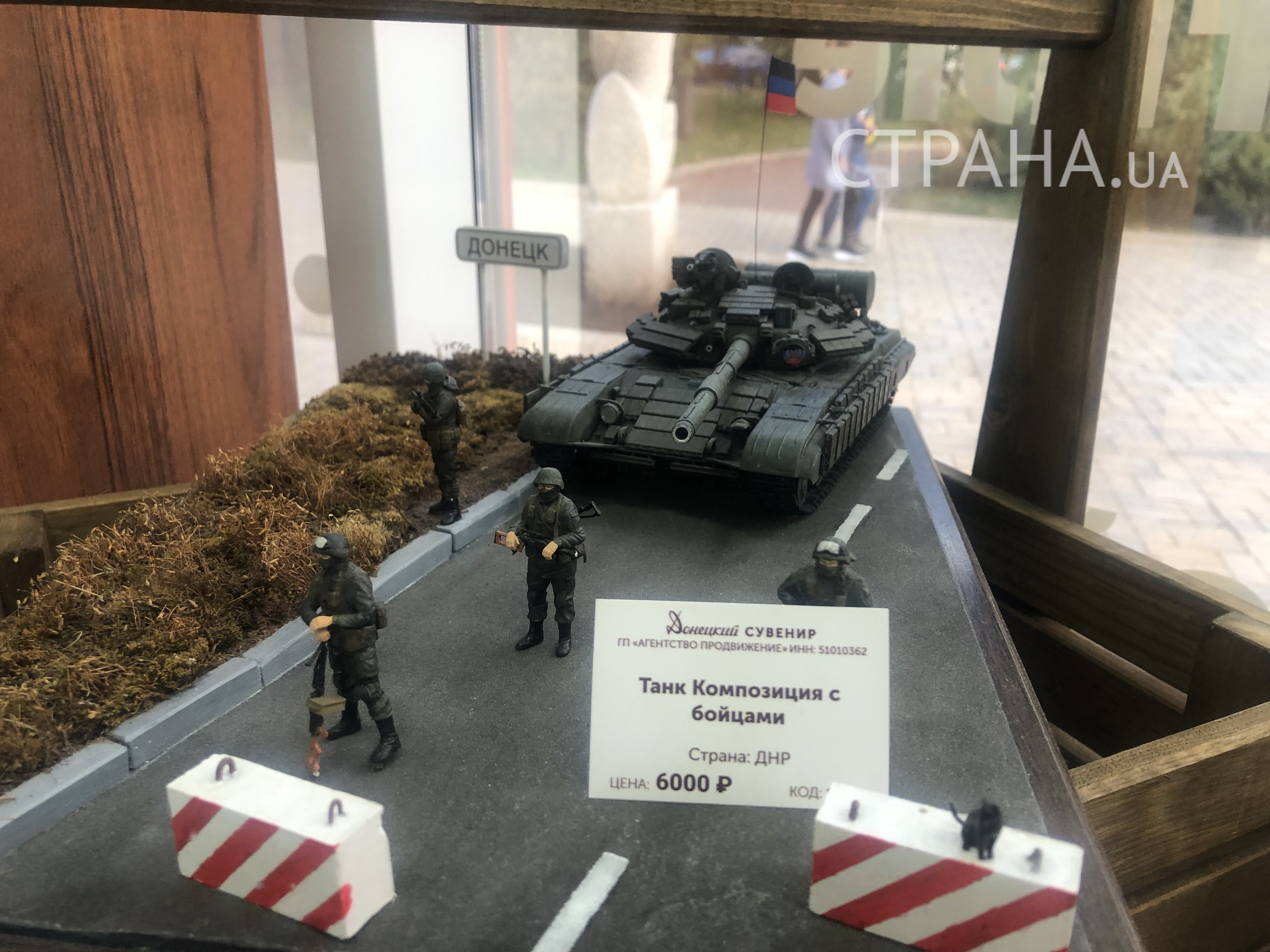 Из других сувениров с местным колоритом - композиция "Танк с бойцами". Как говорит продавец, в ней все, включая солдатиков и кота, сидящего на бетонном блоке - ручная работа. Цена - 6000 рублей (2300 гривен).
