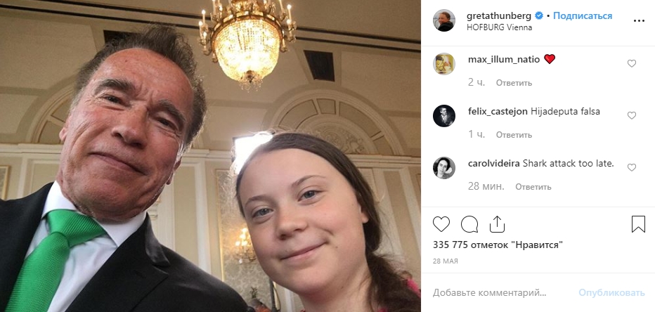 Сам Дональд Трамп опубликовал пост, посвященный Грете, который журналисты, правда, расценили как насмешку. Он запостил видео с гневной речью девочки и подписал: "Она выглядит счастливой молодой девушкой, которая ждет яркого и светлого будущего. Так приятно это видеть!"