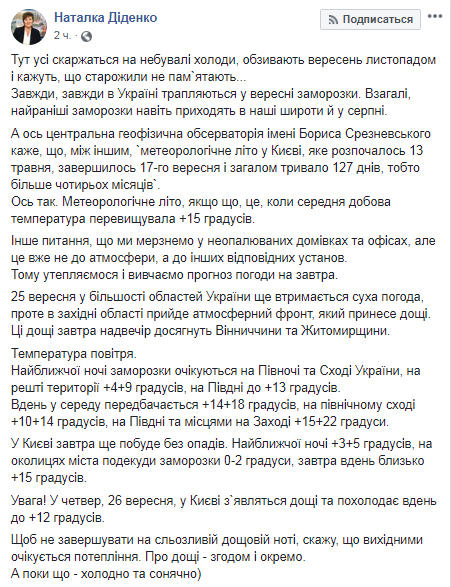 "Здесь все жалуются на небывалые холода, обзывают сентябрь ноябрем и говорят, что старожилы не припомнят... Всегда, всегда в Украине случаются в сентябре заморозки. Вообще, ранние заморозки даже приходят в наши широты и в августе", - написала Диденко.