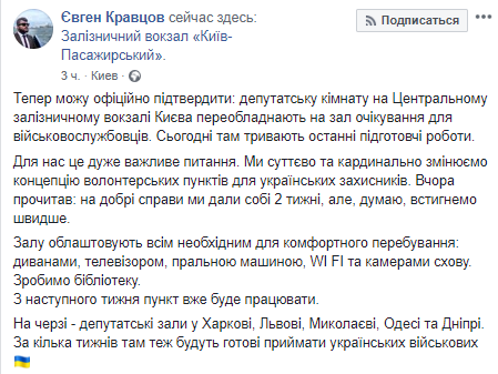 "Теперь могу официально подтвердить: депутатскую комнату на Центральном железнодорожном вокзале Киева переоборудуют в зал ожидания для военнослужащих. Сегодня там идут последние подготовительные работы", - говорится в сообщении.