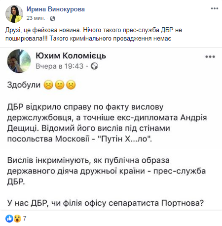 Она разместила на своей странице пост пользователя Ефима Коломойца. Тот утверждал, что из-за высказывания "Путин - Х@@ло" против Дещицы якобы завели дело из-за публичного оскорбления государственного деятеля дружественной страны и якобы об этом сообщила пресс-служба ГБР.