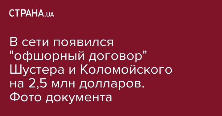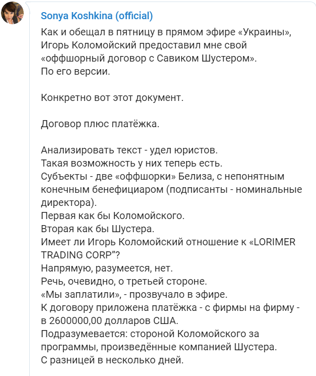 "Субъекты - две "оффшорки" Белиза, с непонятным конечным бенефициаром (подписанты - номинальные директора). Первая как бы Коломойского. Вторая как бы Шустера. Имеет ли Игорь Коломойский отношение к "LORIMER TRADING CORP”? Напрямую, разумеется, нет. Речь, очевидно, о третьей стороне. "Мы заплатили", - прозвучало в эфире. К договору приложена платёжка - с фирмы на фирму - в 2600000,00 долларов США. Подразумевается: стороной Коломойского за программы, произведённые компанией Шустера. С разницей в несколько дней", - написала она.