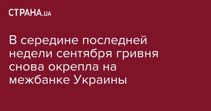 Курс гривны на межбанковском валютном рынке 25 сентября укрепился на 3 копейки, а официальный курс на 26 сентября Национальный банк Украины повысил почти на 9 копеек. Об этом сообщает "Интерфакс-Украина".