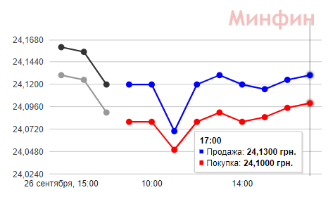 27 сентября НБУ поднял курс доллара на 6 копеек - до 24,18 грн. В обменках доллар вечером покупают за 24,14 грн, продают за 24,17 грн. Межбанк закрылся такими котировки: 24,10 грн - покупка и 24,13 грн - продажа. В банках вечером доллар покупают от 23,80 до 24,12 грн и продают от 24,14 до 24,70 грн. В Приватбанке стоимость валюты такая: покупка - 23,95 грн, продажа - 24,30 грн.