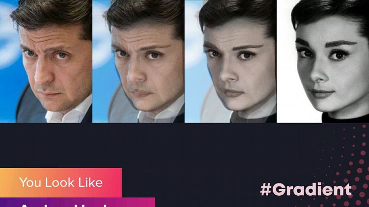 Зеленский, как считает Gradient, похож на британскую актрису и фотомодель Золотого века Голливуда - Одри Хепберн. По всей видимости, программа считала пронзительный взгляд, яркие черты лица и удачный ракурс.