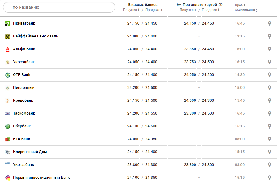 В банках курс доллара с утра был такой: покупка от 23,80 до 24,12 грн и продажа от 24,14 до 24,70 грн.