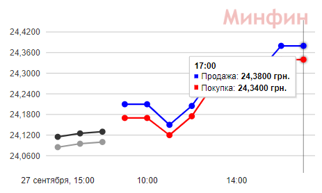 30 сентября НБУ снизил курс доллара на 10 копеек - до 24,08 грн. В обменках доллар вечером стал на 14 копеек дороже, чем утром: покупка - 24,30 грн, продажа - 24,36 грн. Межбанк закрылся поднявшимися на 25 копеек котировками: 24,34 грн - покупка и 24,38 грн - продажа. В банках вечером доллар покупают от 23,80 до 24,36 грн, продают - от 24,24 до 24,70 грн. В Приватбанке стоимость валюты подскочила на 15-19 копеек: покупка - 24,14 грн, продажа - 24,45 грн.