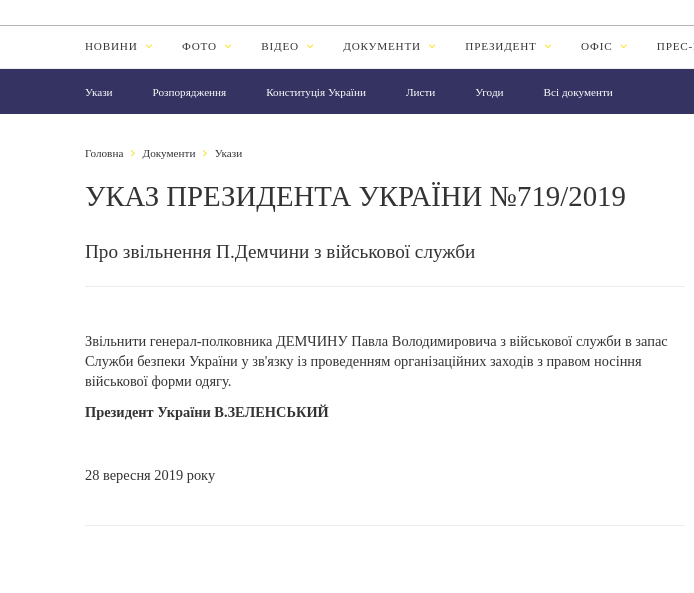 "Освободить генерал-полковника Демчину Павла Владимировича с военной службы в запас Службы безопасности Украины в связи с проведением организационных мероприятий с правом ношения военной формы одежды", - сказано в нем.