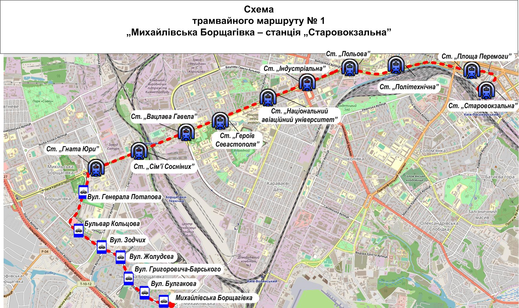 Напомним, что с 28 сентября отменили движение трамваев №2. Вместо них будут курсировать автобусы № 2Т по маршруту: Михайловская Борщаговка - Кольцевая дорога: ул. Симиренко - б-р Кольцова - ул. Литвиненко-Вольгемут - ул. Зодчих - ул. Леся Курбаса, в обратном направлении - ул. Леся Курбаса - ул. Владимира Покотило - б-р Кольцова - ул. Симиренко.