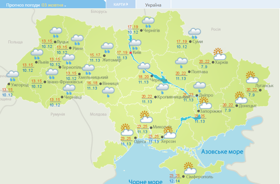 3 октября в Украину снова нагрянут дожди. Они не дойдут разве что до юго-восточных областей. На всей остальной территории возможны небольшие и довольно обильные осадки. На западе похолодает до +13...+15. Зато на юге столбики термометров поднимутся до +25.