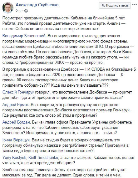 "Посмотрел программу деятельности Кабмина на ближайшие 5 лет. Ребята, это полный провал деятельности уже на старте. Анализ — позже. Сейчас остановлюсь на некоторых моментах - пишет глава Жилищного союза Украины Александр Скубченко.