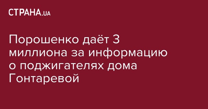 Бывший президент Украины и народный депутат Петр Порошенко объявил о награде в три миллиона гривен за информацию о людях, причастных к поджогу дома экс-главы НБУ Валерии Гонтаревой.