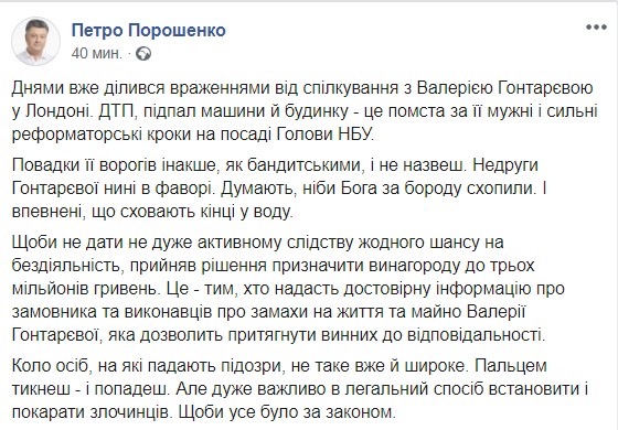 "Чтобы не дать не очень активному следствию ни одного шанса на бездействие, принял решение назначить вознаграждение до трех миллионов гривен. Это - тем, кто предоставит достоверную информацию о заказчике и исполнителях покушения на жизнь и имущество Валерии Гонтаревой, которая позволит привлечь виновных к ответственности", - написал Порошенко.