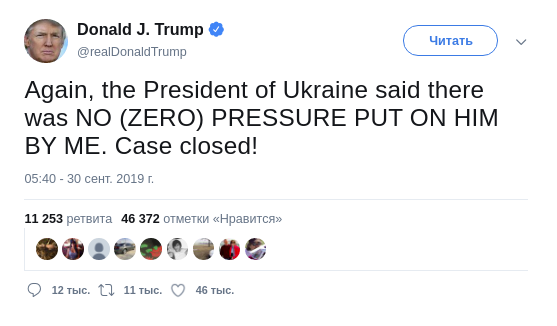 "Еще раз: президент Украины сказал, что не было (ноль) давления на него с моей стороны. Дело закрыто!" - высказался президент.
