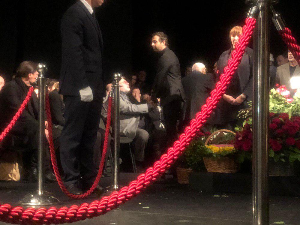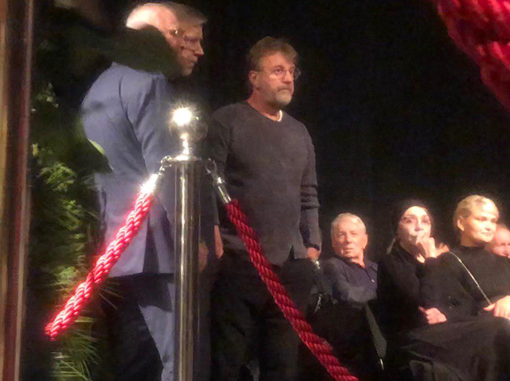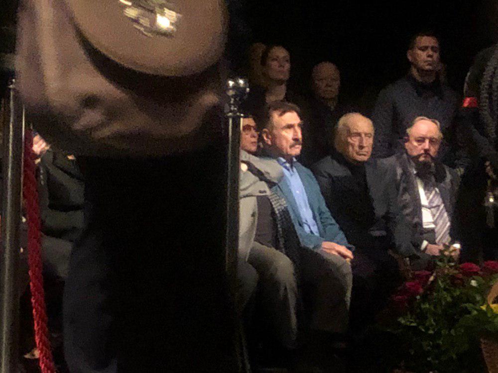 Российская актриса театра и кино и художественный руководитель театра "Современник" Галина Волчек также присутствует в зале. Ее в инвалидной коляске привез актер Сергей Гармаш (на фото стоит за ней). Обращает на себя внимание ее очень болезненный вид и тремор.