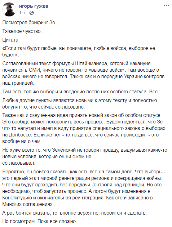 Вероятно, он боится сказать, как есть все на самом деле. Что выборы - это первый этап мирной реинтеграции региона и прекращения войны. Что они будут проходить без передачи контроля над границей. Но это необходимо, чтоб запустить процесс. А потом будут изменения в Конституцию и окончательная реинтеграция. Как это и записано в Минских соглашениях.