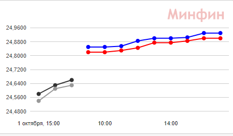 2 октября доллар резко подорожал в обменках и банках. Курс НБУ сегодня был 24,56 грн - на 36 копеек, чем вчера. Но в банках и на наличном рынке американская валюта взлетела еще больше. В обменках доллар за день подорожал сразу на 50 копеек: вечером его покупали за 25,5 грн и продавали за 25,75 грн. А в некоторых банках к вечеру продажа и вовсе достигла психологической отметки в 26 грн (продажа). На межбанке доллар также подорожал за день, но не так значительно - покупка 24,90 (+6 копеек) грн, продажа - 24,93 (+5 копеек).