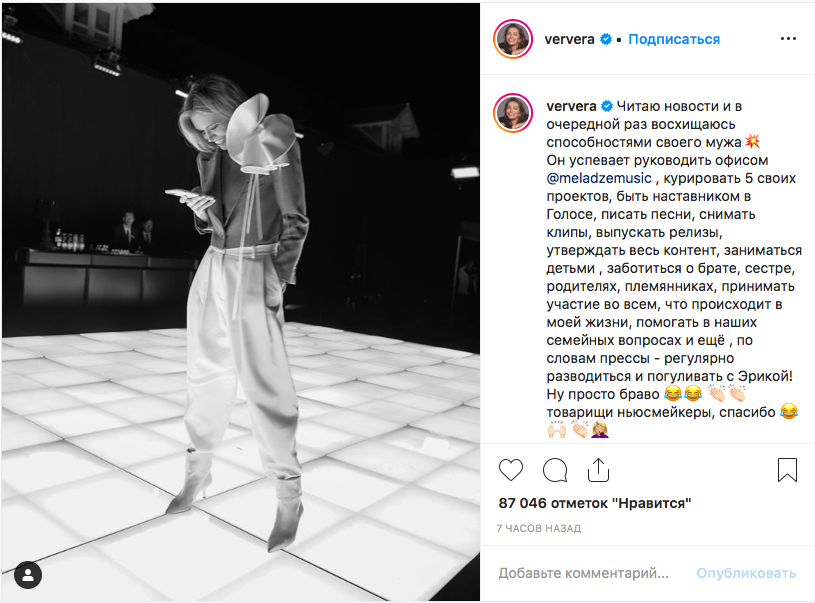 "Он успевает руководить офисом MeladzеMusic, курировать пять своих проектов, быть наставником в "Голосе", писать песни, снимать клипы, выпускать релизы, утверждать весь контент, заниматься детьми, заботиться о брате, сестре, родителях, племянниках, принимать участие во всем, что происходит в моей жизни, помогать в наших семейных вопросах и еще, по словам прессы, регулярно разводиться и погуливать с Эрикой!" - написала Вера Брежнева и прикрепила к сообщению свое черно-белое фото, на котором она в оригинальной блузе с улыбкой смотрит в смартфон.