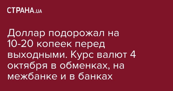4 октября доллар на разных площадках подорожал в среднем на 10-20 копеек. В обменках к вечеру его покупают за 25 грн, продают за 25,10 грн. Межбанк перед выходными закрылся с котировками 24,78 грн - покупка и 24,83 грн - продажа. В банках  доллар также немного подорожал в покупке на 5-20 копеек, в зависимости от банка, а вот продажа практически не изменилась.