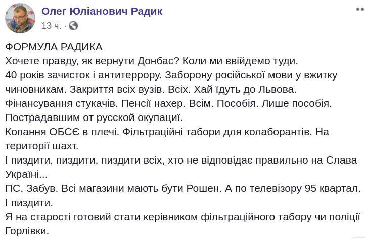 Радык саркастично добавил, что все магазины должны быть "Рошен". А по телевизору "95 квартал". Также он заявил, что на старости лет согласен быть начальником фильтрационного лагеря в Горловке.