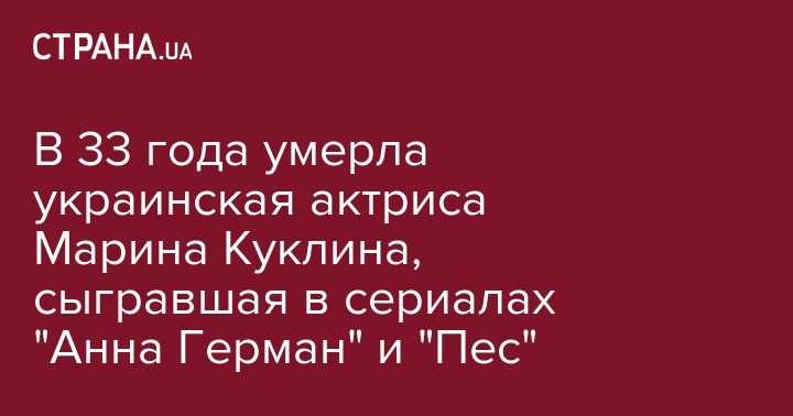 На 34-м году жизни умерла известная украинская актриса театра и кино Марина Куклина. Новость о ее смерти первой сообщила коллега Марины Римма Зюбина в своем Facebook.