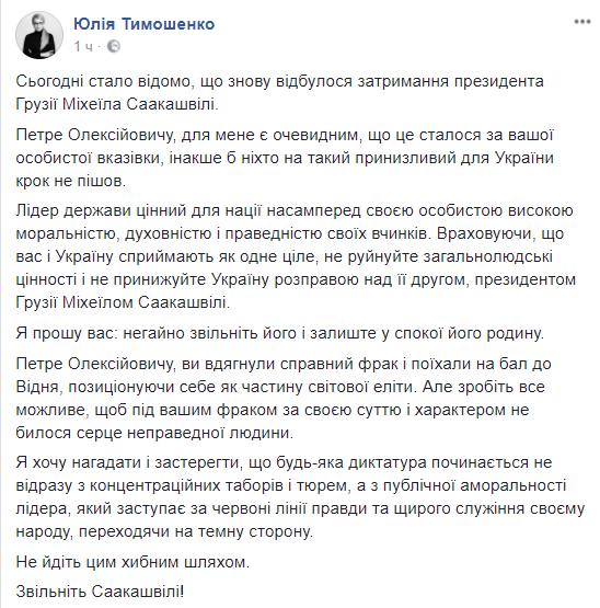 "Согласно заявлению, которое пришло в Госбюро расследований, служебжные лица правоохранительных органов, действуя по предварительному сговору с Порошенко П.А., используя служебное положение, вопреки интересам службы осуществили умышленные действия, направленные на незаконное вывезение Саакашвили М.Н. с территории Украины, чем причинили ущерб его охраняемым законом правам, сводам и интересам, что привело к тяжким последствиям", - говорится в фабуле уголовного производства.