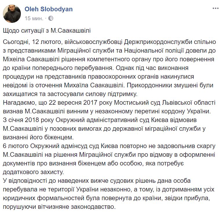 "12 февраля, военнослужащие Госпогранслужбы совместно с представителями Миграционной службы и Национальной полиции довели до Саакашвили решение компетентного органа о его возвращении в страну предыдущего пребывания. Однако во время выполнения процедуры на представителей правоохранительных органов набросились неизвестные из окружения Михаила Саакашвили. Пограничники вынуждены были защищаться и применили силовую поддержку", - сообщил спикер пограничников Олег Слободян на своей странице в Facebook, явно ставя тему с ног на голову: ворвавшийся спецназ якобы не нападал, а защищался.