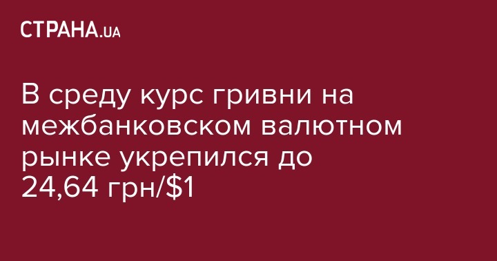 В среду курс гривни на межбанковском валютном рынке укрепился до 24,64 грн/$1