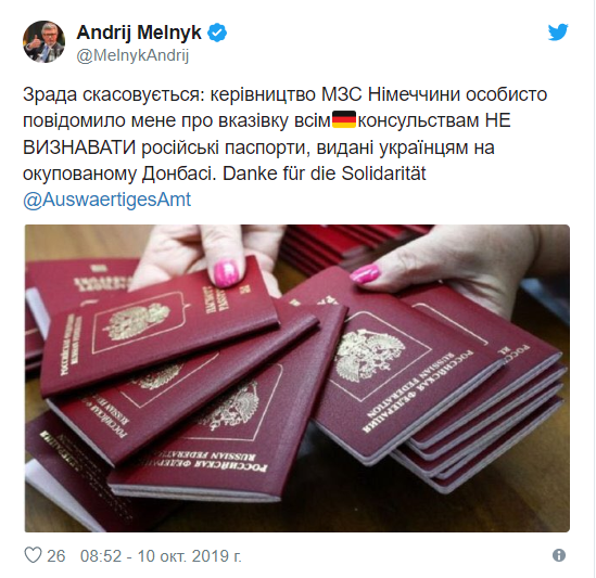 "Зрада отменяется: руководство МИД Германии лично сообщило мне об указании всем немецким консульствам не признавать российские паспорта, выданные украинцам на оккупированном Донбассе", - написал он в своем микроблоге в Twitter.