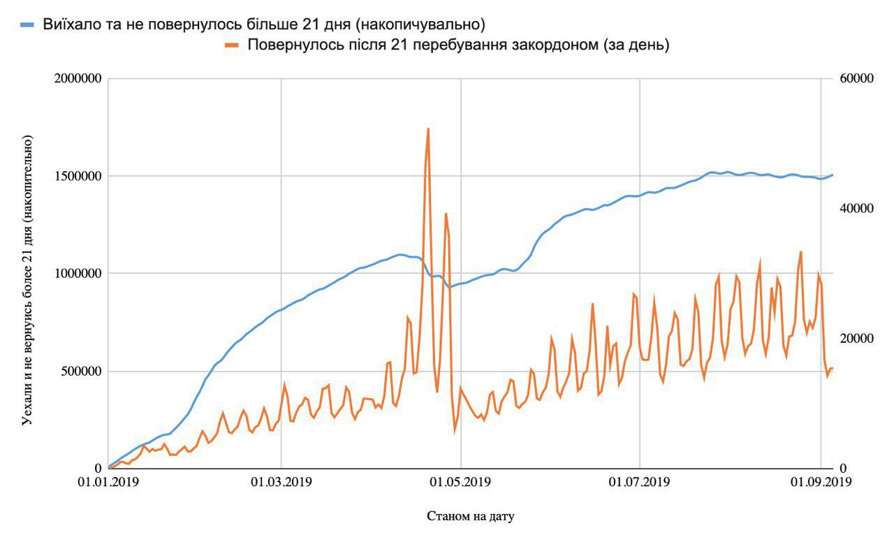 Дубилет поделился с подписчиками информацией, которую взял из баз данных по пересечению границы. Он посчитал количество украинцев, которые выехали заграницу и не вернулись в течение более чем 21 дня, а также тех, кто вернулся после 21-дневного отсутствия.