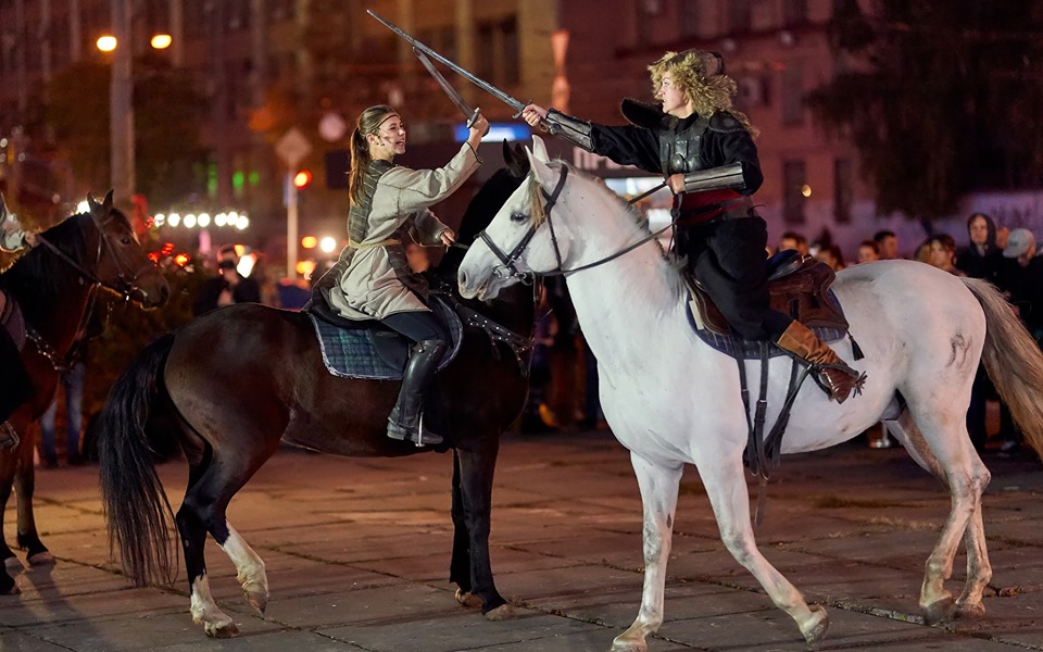 Зрителей развлекали шоу в духе исторического сюжета фильма с лошадьми, всадниками, огненным шоу и барабанами.