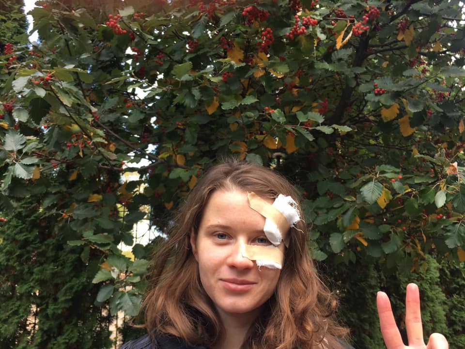 Одна из участниц акции описала события под посольством и прикрепила фото, на котором у девушки заклеен пластырем и бинтом участок на левом виске и под глазом.