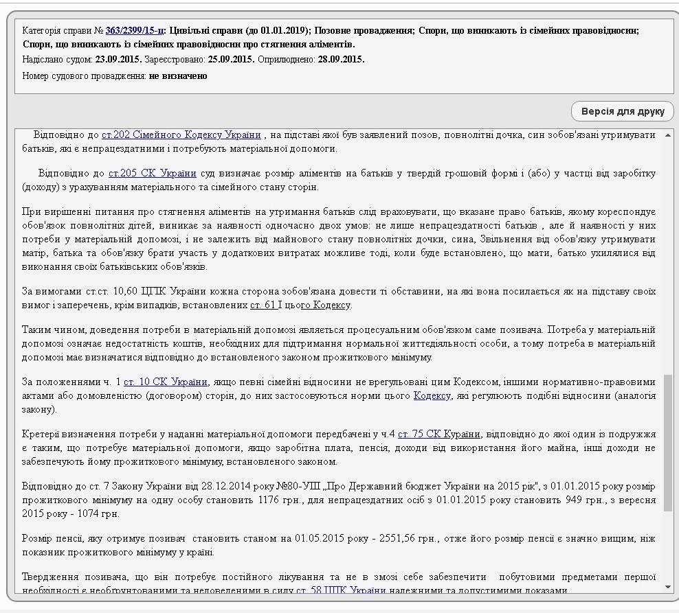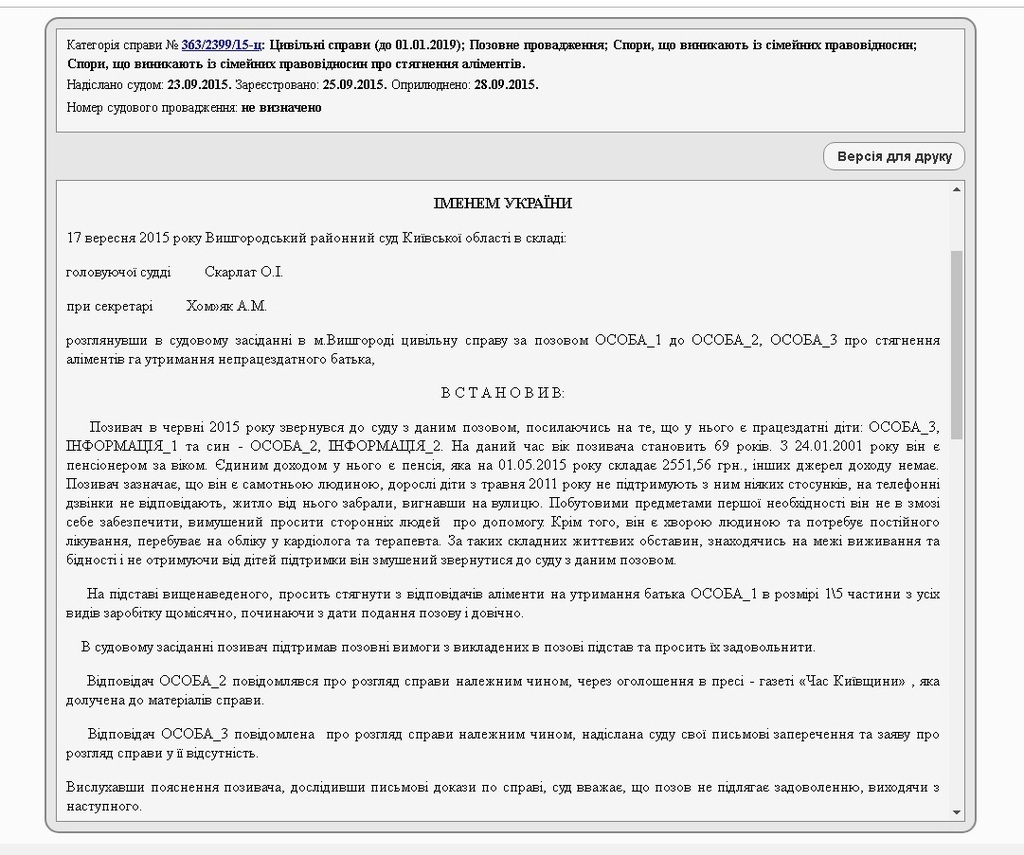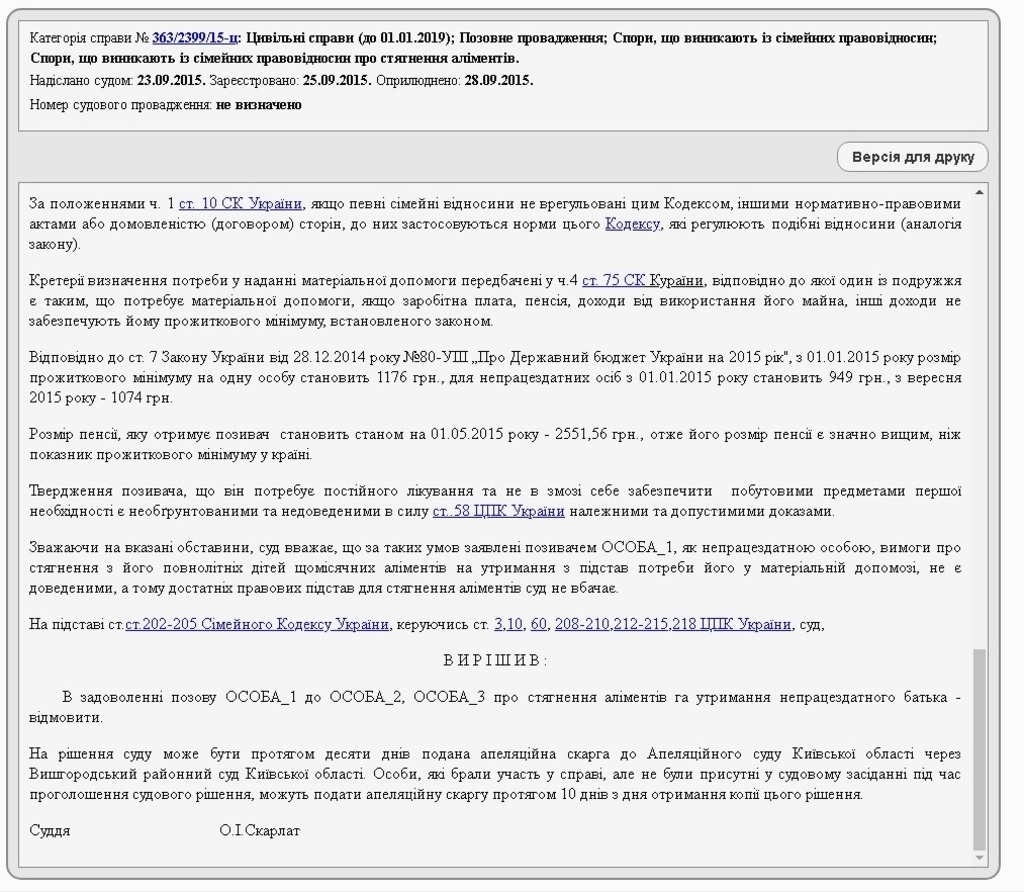 Однако судья Елена Скарлат отказала в удовлетворении исковых требований. Основаниями для отказа, как следует из материалов дела, является то, что Георгий Рябошапка получает пенсию по возрасту, которая на тот момент составляла 2551,56 грн и превышала установленный на тот момент законодательством прожиточный минимум (1176 грн), а также на правах совместной собственности отцу, согласно информации суда, принадлежала 1/3 квартиры. Кроме того, он указан как владелец автомобиля.