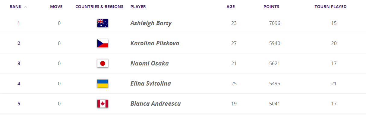 Первая в рейтинге - австралийка Эшли Барти (7096). Далее расположились чешка Каролина Плишкова (5940) и японка Наоми Осака (5621). Украинка Свитолина с 5495 очками всего на несколько очков опережает Бьянку Андрееску из Канады (5041).