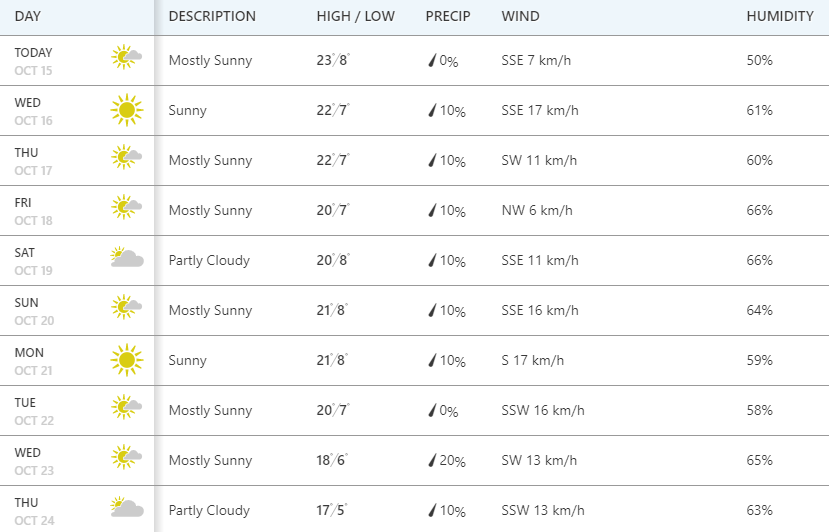 Сайт Weather.com сообщает, что в ближайшие дни погода будет преимущественно солнечной. Самым теплым днем будет 15 октября, когда температура поднимется до +23. В среду и четверг, 16 и 17 октября, будет до +22 днем и +7 ночью. Такая погода продержится до конца недели.