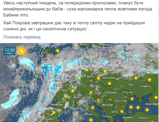 Синоптик ресурса Opogode Наталья Диденко сообщила, что эта неделя предстоит сухой и малооблачной. В целом будет теплая октябрьская погода - "бабье лето.