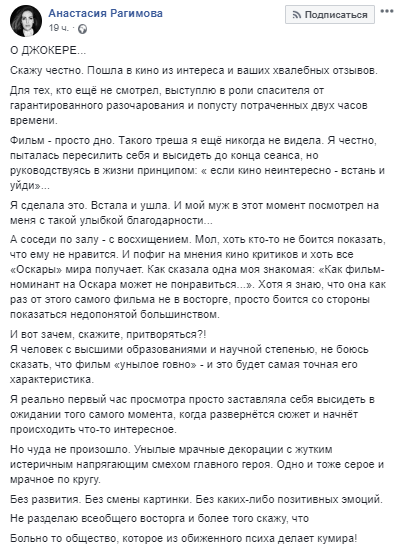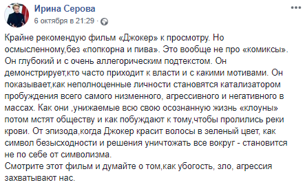 "Крайне рекомендую фильм "Джокер" к просмотру. Но осмысленному, без "попкорна и пива". Это вообще не про "комиксы". Он глубокий и с очень аллегорическим подтекстом. Он демонстрирует, кто часто приходит к власти и с какими мотивами. Он показывает, как неполноценные личности становятся катализатором пробуждения всего самого низменного, агрессивного и негативного в массах. Как они, унижаемые всю свою осознанную жизнь "клоуны" потом мстят обществу и как побуждают к тому, чтобы пролились реки крови. От эпизода, когда Джокер красит волосы в зеленый цвет, как символ безысходности и решения уничтожать все вокруг - становится не по себе от символизма. Смотрите этот фильм и думайте о том, как убогость, зло, агрессия захватывают нас" - написала Ирина Серова.