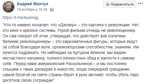 "Кто-то наивно полагает, что "Джокер" – это картина о революции. Нет, это кино о кризисе системы. Герой фильма отнюдь не революционер. Он сам говорит об этом, утверждая, что действует вне политики. Великие революционеры – это харизматичные фигуры, которые ведут за собой благодаря воле, организаторским способностям, знаниям. Им хочется подражать. Но наблюдая за Артуром Флеком, мы видим несчастного человека, полного личностных обид и жалости к самому себе. Перед нами американский Раскольников – и мы постоянно слышим о таких джокерах в новостях, когда очередной гражданин самой богатой на свете страны берет в руки автомат, чтобы убить пару десятков своих сограждан" - написал Манчук.