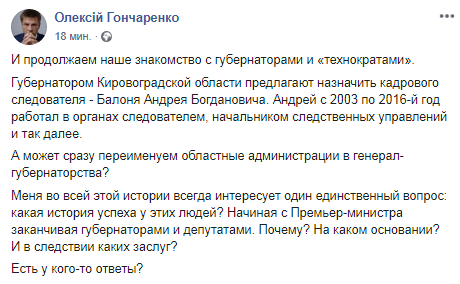 По его словам, кандидат на должность губернатора Кировоградской области - Андрей Богданович Балонь; Сумской - Сергей Вячеславович Леонов; Черниговской - Андрей Леонидович Прокопенко. Нардеп Гончаренко также отметил, что Кабмин решил перенести вопрос об их назначении на следующее заседание и пригласить кандидатов.