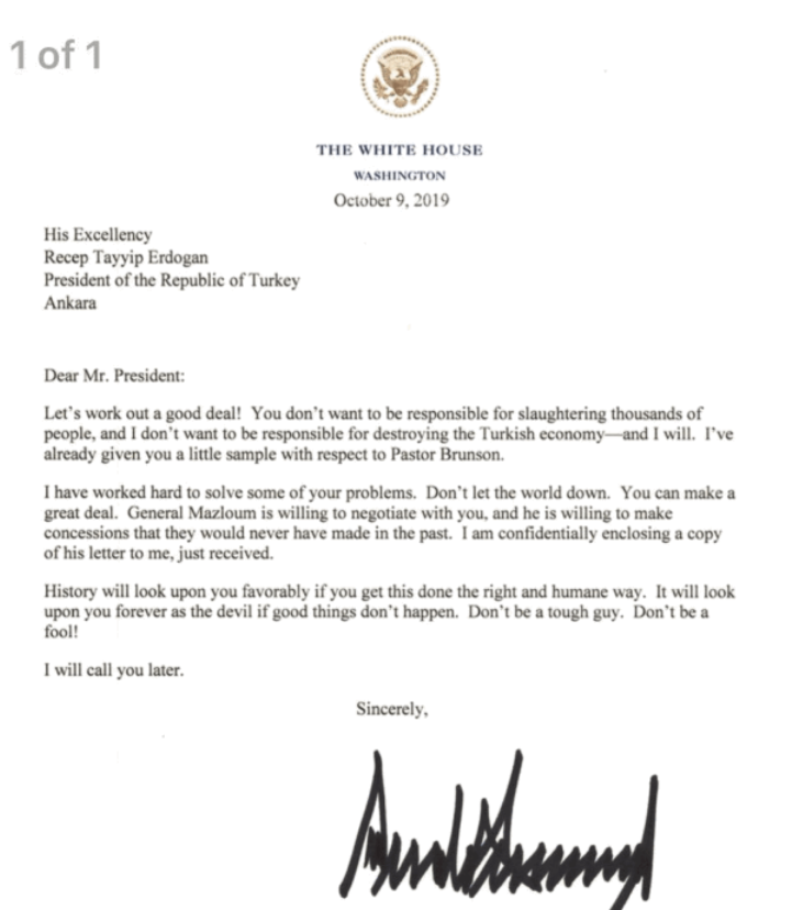 Письмо датировано 9 октября. В тот день Турция начала в Сирии свою военную операцию "Родник мира". Копию письма показал телеканал CNN.