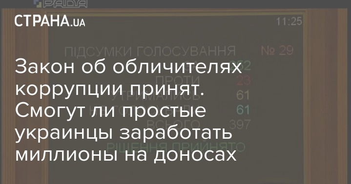 17 октября Верховная Рада приняла в целом законопроект о вознаграждения для обличителей коррупции. Каждому, кто сдаст коррупционера, обещают премию до 10% от размера суммы преступления, но не больше 3 тысяч минималок. То есть за донос на нечистых на руку чиновников можно получить максимум 12,5 млн грн.