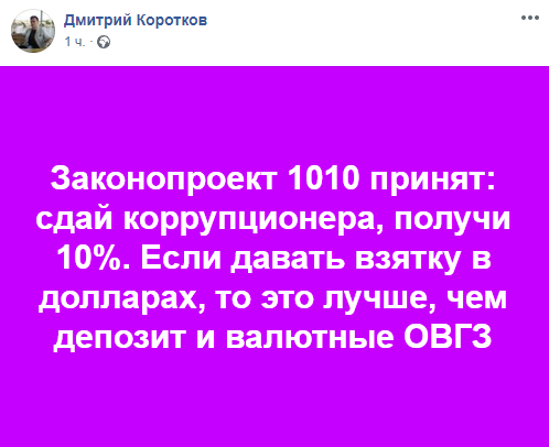 "Законопроект 1010 принят: сдай коррупционера, получи 10%. Если давать взятку в долларах, то это лучше, чем депозит и валютные ОВГЗ" - написал журналист Дмитрий Коротков.