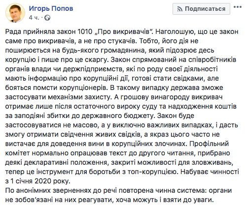 "Рада приняла закон 1010 "Об обличителях". Подчеркиваю, что это закон именно об обличителях, а не о стукачей. То есть, его действие не распространяется на любого гражданина, который подозревает где-то коррупцию и пишет на это жалобу.
